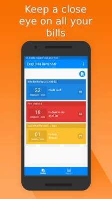 When you add your bills to the app, they will be automatically sorted into bills that are overdue, bills that are due today, and bills that are due within the next 10 days.