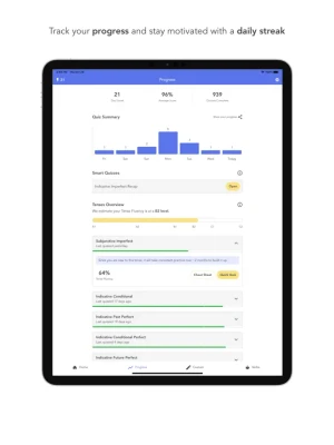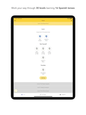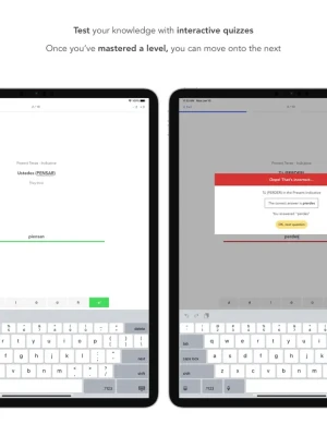 - 30 levels (6 for free) with bite-sized lessons and quizzes guiding you through 16 tenses.