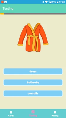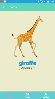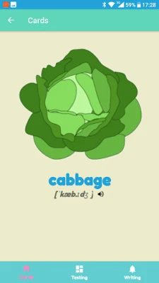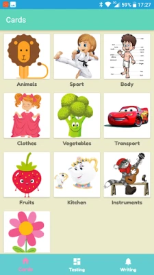 Application contains 10 categories (about 200 words with transcription and pronunciation): -Transport. -Vegetables -Fruits -Sport -Animals with voices -Fruits and etc.. At the end of learning, you can try 2 ways of examination - testing and writing practice.