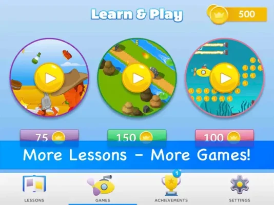 Start learning and playing right away: complete the first lessons, earn coins, and launch mini-games!