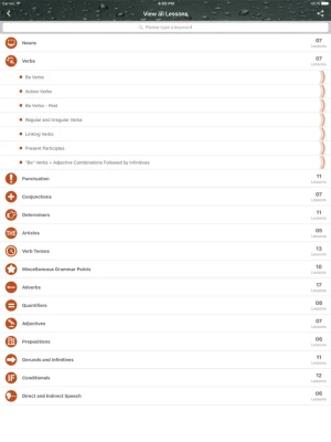2) We also have all the lessons grouped together by types such as Nouns, Verbs, Articles, Adverbs, Verb Tenses, etc.