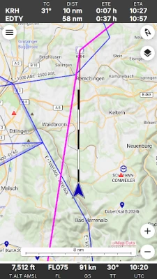 Enroute features a moving map similar in style to the official ICAO maps. Your current position and your flight path for the next five minutes are marked, and so is your intended flight route. A simple tap gives you all the information about airspaces, airfields, and navaids – complete with frequencies, codes, elevations, and runway information.