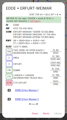 Enroute supports essential flight planning. It allows you to quickly and easily compute distances, courses, and headings. It gives you an estimate for flight time and fuel consumption. If the weather turns bad, the app will show you the closest airfields for landing, complete with distances, directions, runway information, and frequencies.