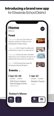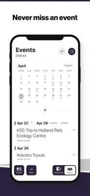 NEVER MISS AN EVENT The event section shows a list of events throughout the district. Users can add an event to their calendar to share the event with friends and family with one tap.