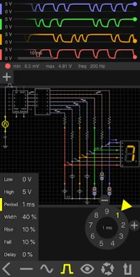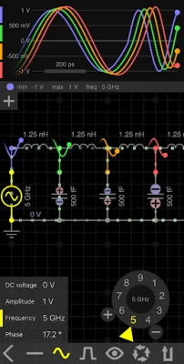 Build any circuit, tap play button, and watch dynamic voltage, current, and charge animations. This gives you insight into circuit operation like no equation does. While simulation is running, adjust circuit parameters with analog knob, and the circuit responds to your actions in real time. You can even generate an arbitrary input signal with your finger!