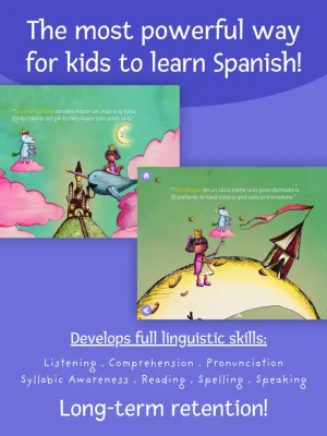 Our beautiful, fun stories and games are infused with a unique methodology that enables your child to subconsciously acquire Spanish skills while he/she listens and plays!
