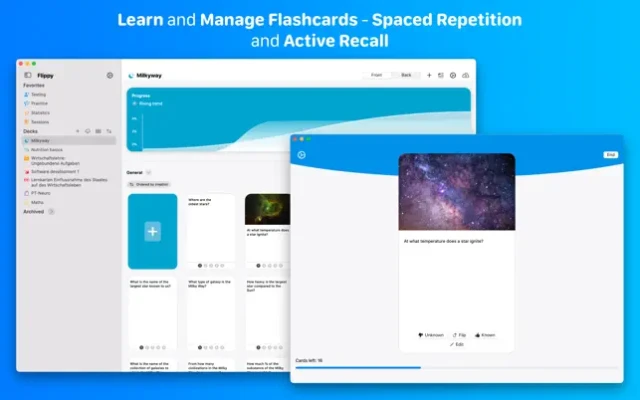 Did you know, that you forget 40% of the stuff you learned after one hour? Or, did you know, that you only remember 30% of your lecture after one day? With Flippy these times are over. Flippy is a flashcard app that uses smart algorithms and modern technology like ARKit to improve learning. This way you can master every exam or just learn for life better.