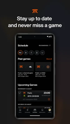 Stay up-to-date when matches go live through push notifications and see a clear view of what games are coming up next for Fnatic across all our different game titles.