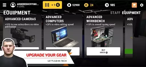 - Ability to hire staff and install various equipment in the garage - lifters, cameras and more. Both equipment and employees give bonuses to various stats, such as tuning speed or subscribers growth;