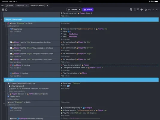 - Write game logic with GDevelop's innovative event system based on "if / then" actions and conditions.