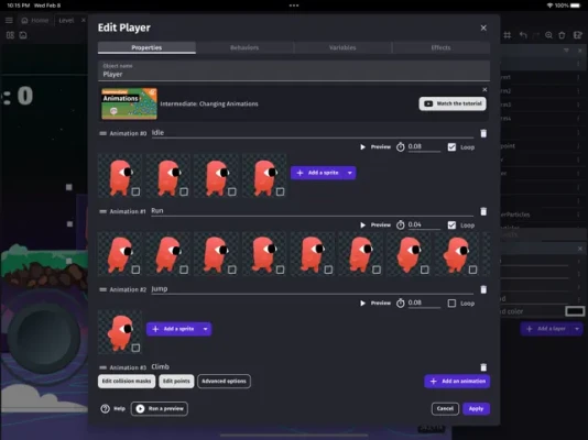 - Quickly add pre-made logic to your game objects with GDevelop's Behaviors.