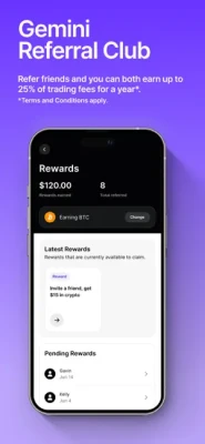 Refer friends and you can both earn up to 25% of trading fees for a year.* Our tiered rewards program complements our existing $15 USD referral bonus when you invite a friend to Gemini and they trade at least $100 USD.