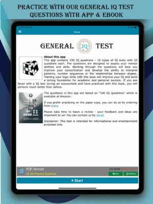 This app contains 100 IQ questions - 10 types of IQ tests with 10 questions each. The questions are designed to assess your mental abilities and skills. Working through the questions will help you improve your concentration and develop the ability to interpret patterns, number sequences or the relationships between shapes. Training your logic skills with this book will improve your IQ and build a strong foundation for academic and personal success. If you are faced with a IQ test during an assessment and have practiced with this book, you will perform much better than before. Disclaimer: This test is intended for informational and entertainment purposes only.