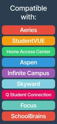 Compatible with Aeries, StudentVUE/ParentVUE, Home Access Center (HAC), PowerSchool, The Source (Seattle Public Schools), Aspen, Infinite Campus, Skyward, SchoolBrains, Q Student/Parent Connection, Gradelink, Schoology, and Frontline.