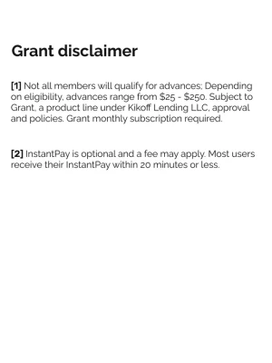 *Not all applicants will meet eligibility requirements or qualify for a Cash Advance offer. Offer amounts range from $25 - $250 and are based on Grant’s eligibility requirements. Avg advance $79 from 07/2024 to 12/2024.