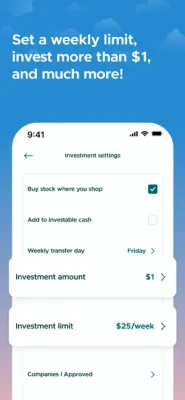 Personalized investing on your terms: Set a weekly investment limit, pause for a week at a time, adjust your company risk tolerance, increase beyond $1 per transaction, disable any company you transact at but don't want to invest in, and many more customization features.