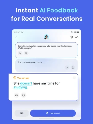 - AI Tutor: Overcome the anxiety of speaking with real teachers! Hablo's AI tutor creates a relaxed environment to boost your confidence and practice without pressure.