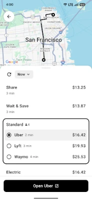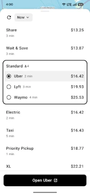 > Tap any ride to open the provider's app with your route and ride type already selected. Just hit confirm to book the ride.