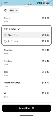 > Instantly view every available ride. See which provider has the lowest price or the shortest wait. No more app-switching.