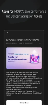 - You can apply for SBS Inkigayo tickets through My Page > Events > Apply.