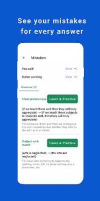 After every test, you see an overall feedback plus answer-level feedback. The app uses these results to recommend what you should practice next so you are always working on your real weaknesses.