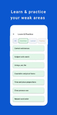 • Separate scores for Fluency, Grammar, Vocabulary, and Pronunciation