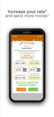 Download the InterCambio Express app and start sending money to your family members now, from and wherever you want. Choose the exchange rate that suits you best, using SuperSend®.