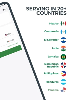• Transfer to Argentina, Bolivia, Brazil, Chile, Colombia, Costa Rica, Ecuador, Guatemala, Honduras, India, Jamaica, Mexico, Nicaragua, Panama, Peru, Philippines, Dominican Republic, El Salvador, and Vietnam from our App.