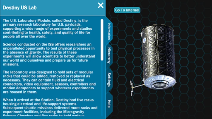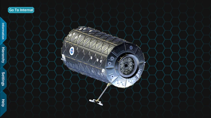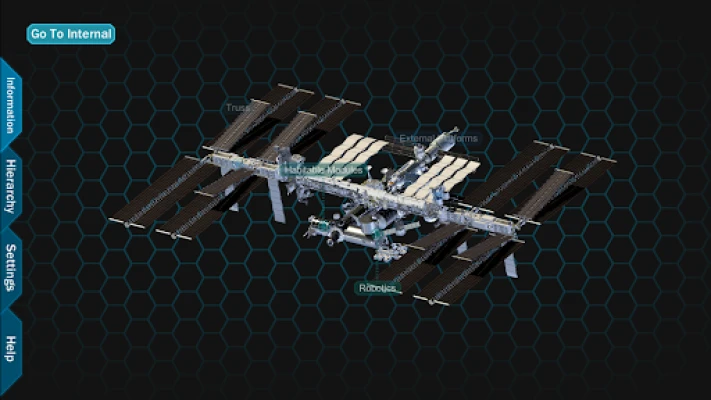 When the application starts, you can see a view of the entire ISS with category labels. Tabs are available on the left hand side of the screen which allow you access to information, the hierarchy, settings and application information. From this point, you can zoom into the station, revealing more labels of visible parts. The station can also be rotated to view from different angles. If a part is selected, the part is isolated so that you can focus on the specific piece. The information tab shows information about the currently isolated part.