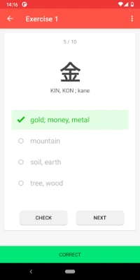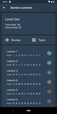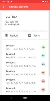 To make learning kanji more comfortable, the list is divided into six levels according to Japanese school grades. Every level has lessons that generally contain 10 characters and include 3 parts: characters listing, exercises and revision. Kanji list represents characters, their readings and meanings. Interactive exercises include: - Flashcards that may be useful to study or revise characters one by one - Tests with instant results that allow to evaluate how you know the characters