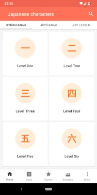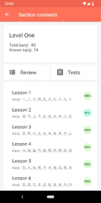 To make learning kanji more comfortable, the list is divided into six levels according to Japanese school grades. Every level has lessons that generally contain 10 characters and include 3 parts: characters listing, exercises and revision.
