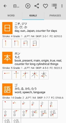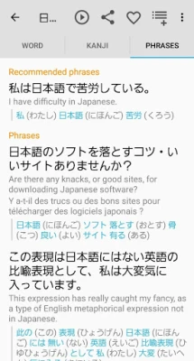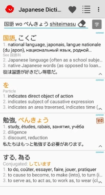 Offline Japanese-English dictionary and Japanese language learning study tool. Includes example sentences, kanji information and conjugated forms for each word. Some Japanese words are also translated to many other languages (see below).