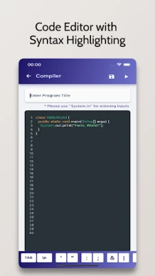 Java Compiler is an Advanced IDE enabling you to compile Java Programs on your Mobile Phone for Free. It comes with a code editor with in-built syntax highlighting capabilities.