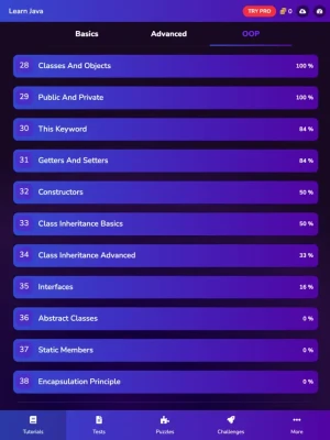 Learn Java by climbing ranks (like in a game) for completing tasks. This way you can become job ready by finishing challenges and many exercises.The app is suitable for both beginners and more experienced Java learners. You can start your Java coding journey or extend your existing knowledge in more advanced topics such as OOP - Object oriented programming.