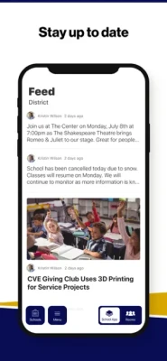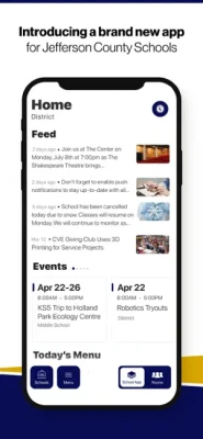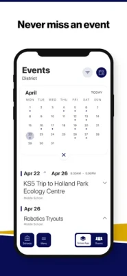 NEVER MISS AN EVENT The event section shows a list of events throughout the district. Users can add an event to your calendar to share the event with friends and family with one tap.