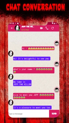 This app allows you to set incoming fake call, fake video call and a chat simulation with the Scary Jeff The Killer it is a dial app that simulate receiving calls and video calls from the creepy Jeff The Killer and also have a long chat with him, it can easily be used to prank friends or family members and watch their surprised faces when they receive the horrific call, it my also have many other features as you will find below this dial app will allow you to use your phone in order to prank your friends because it gives a simulation of talking and chatting with the sweet and funny scary Jeff The Killer. thanks to this app you won't get bored easily and you will have the possibility to receive lots of calls and chat messages.