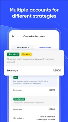 - Standard: Low entry at $10, multiple currencies, spreads from 0.3, and 1:3000 leverage.