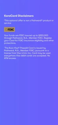 Kora Visa® Prepaid Card is issued by Pathward, N.A., Member FDIC, pursuant to a license from Visa U.S.A. Inc. Card can be used everywhere Visa debit cards are accepted. No Cash Access.