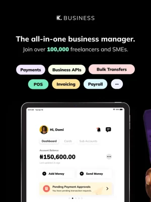 Kuda Business is the all-in-one business manager for Nigerian freelancers and SMEs. Open a business bank account, accept transfers and card payments, get a POS, send invoices, manage expenses, make bulk transfers, and pay business bills.