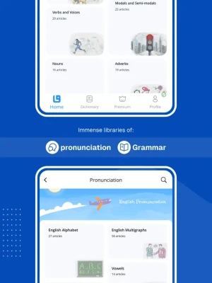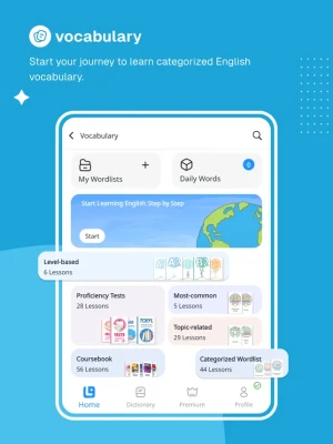 More than 20000 English words, categorized into different lessons based on their level or topic. Vocabulary lesson includes:
