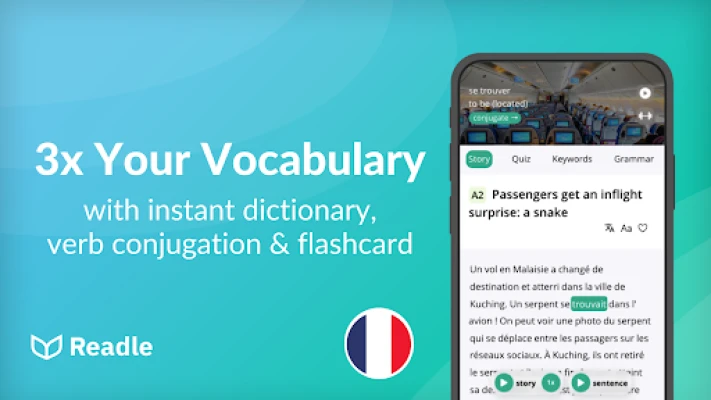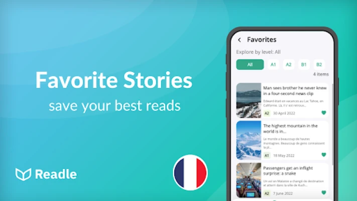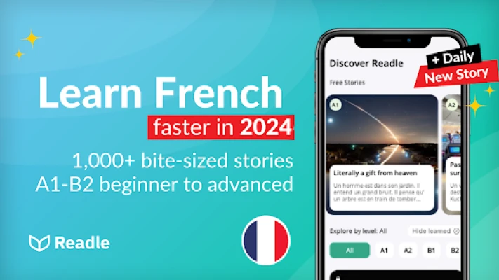 Readle is a language learning app with real-world news & stories. It is the world's first CEFR-graded reader to help you learn French. Easily read & listen to news & stories anytime, anywhere – Take 5 minutes a day to learn French.
