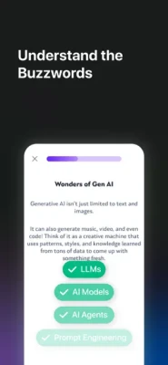 - Bite-sized & Interactive AI Lessons: Understand AI and gen AI step-by-step with easy-to-follow lessons. Complex topics like machine learning and gen AI (e.g. how ChatGPT works) are broken into simple, bite-sized chunks that make learning AI fun and engaging.