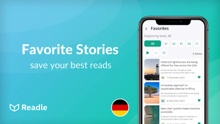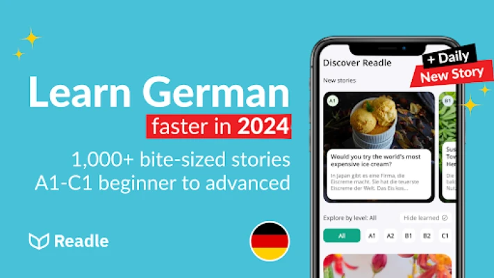 Readle is a unique and effective German language learning app. Learn German in context with over 1,000 easy and entertaining stories at your level. Build your German vocabulary with smart flashcards from topics you enjoy the most.
