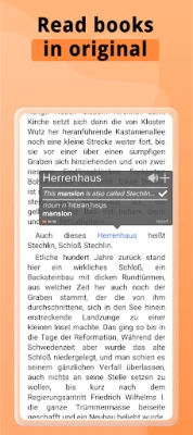 📚 Lots of original materials. The application contains videos, articles and books in English, German, French, Spanish and other languages. All content is categorized by difficulty and genres. Everyone can find something to read or watch - even the beginners.