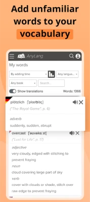 You can translate words in one click, which saves a lot of time. The combination of dictionary entries and contextual translation allows you to quickly get the full meaning of a word. You can also add unfamiliar words and word combinations to your vocabulary and go over them whenever you like. Immersing in original content is an effective, fast and convenient way to learn any language.