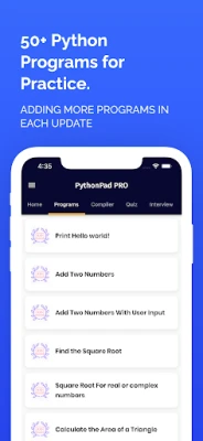 This app contains 50+ python programs that are ready to executes. You can look and study these programs and execute it in the python compiler.