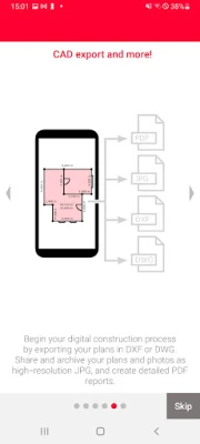 All measurements and floor plans can be exported as a CAD drawing, JPG or in a PDF format. CAD exports are possible as DXF or DWG format, which allows to seamlessly integrate the measurement data with digitized construction. PDF export detailed reports include all created measurements in easy to read and understandable structure.
