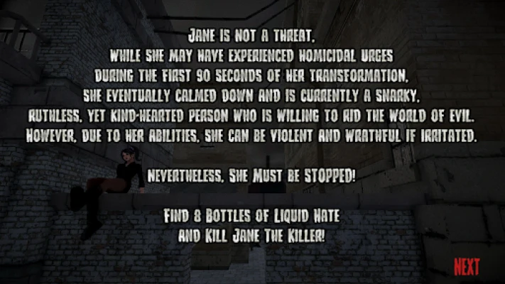 You need to find 8 bottles of liquid hate and try to kill Jane The Killer.