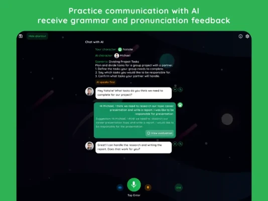 - Chat with AI: Practice conversations with smart AI, simulating real-life communication situations such as ordering food, job interviews, or casual conversations. AI will adjust the difficulty based on your level, helping you improve every day.