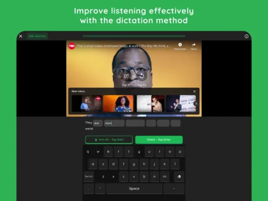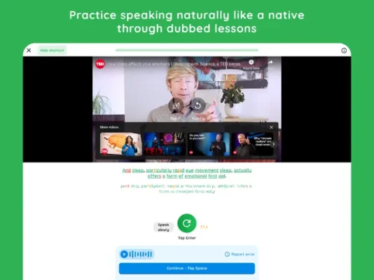 - Listen and repeat sentences from videos with instant feedback on accuracy.